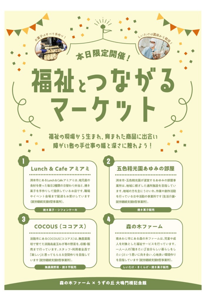 「福祉と繋がるマーケット」は、11月15日(土)当日限りのイベントとなっております!淡路島に来られた際にはぜひうずの丘 大鳴門橋記念館にお立ち寄りください!スタッフ一同お待ち致しております!