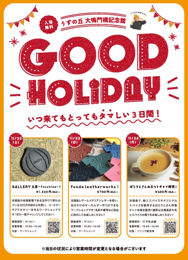 うずの丘 大鳴門橋記念館では、2025年11月22日(土)・23(日)・24(月)の3連休に、「GOOD HOLIDAY~いつ来てもとってもタマしい3日間!~」を開催いたします!いつ来ても新しい楽しみがある3日間となっております!