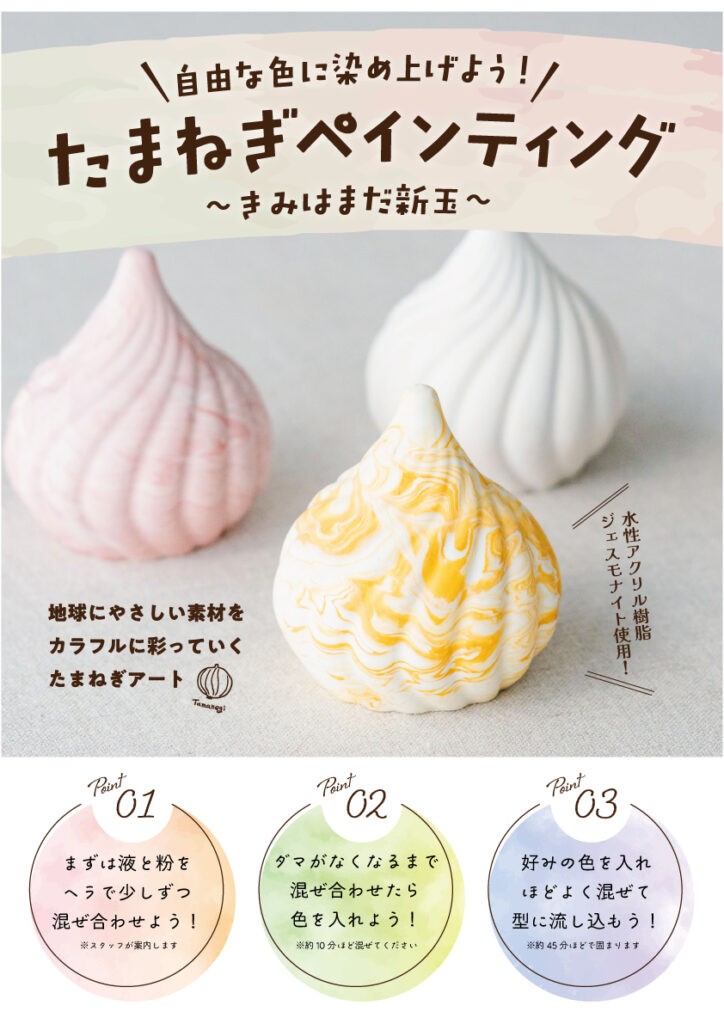 前回大好評いただいた「たまねぎペインティング」の第2回を開催!環境と人体に優しい次世代の素材「ジェスモナイト」を使い、たまねぎオブジェを作ろう!配色はあなた次第!1個1,100円で自分だけの素敵なたまねぎをお作りいただけます!