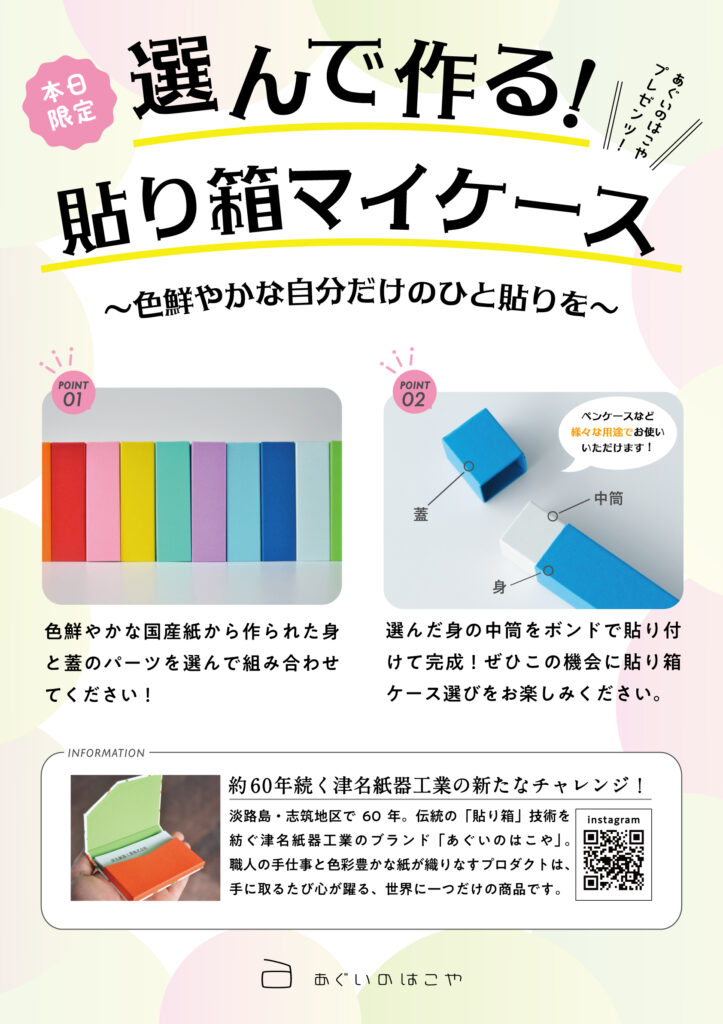津名紙器工業・あぐいのはこやプレゼンツ!「選んで作る貼り箱マイケースを1日限定開催いたします!」まずは色鮮やかな国産紙から作られた身と蓋のパーツを選んで組み合わせてください!最後に選んだ身の中筒をボンドで貼り付けて完成!ぜひこの機会に貼り箱ケース選びをお楽しみください。